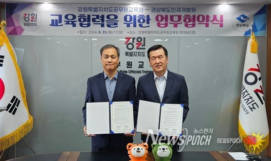 뉴스펀치 김호정 기자 | 강원특별자치도 공무원교육원은 경상북도 인재개발원과 6월 25일 강원특별자치도공무원교육원에서 업무협약을 체결했다.