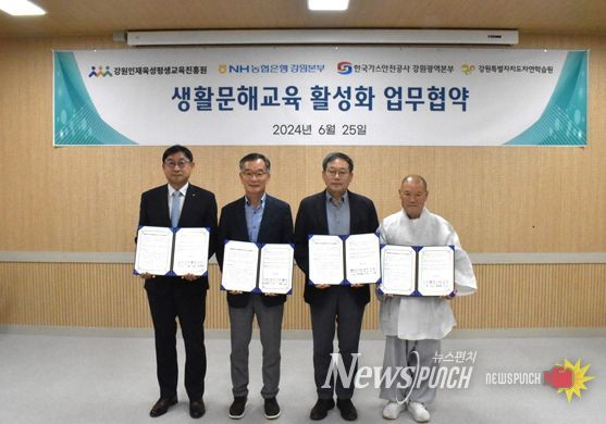 뉴스펀치 김호정 기자 | 강원인재육성평생교육진흥원은 25일, NH농협은행 강원본부, 한국가스안전공사 강원광역본부, 강원특별자치도자연학습원과 생활문해교육 활성화 공동협력 업무협약을 체결했다.