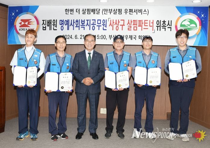 뉴스펀치 박상훈 기자 | 부산 사상구는 지난 21일 ‘한번 더 살핌배달’에 참여하는 부산사상우체국 소속 집배원 44명을 명예사회복지공무원으로 위촉했다고 밝혔다.