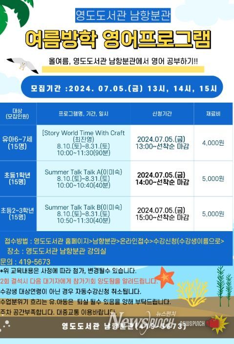 뉴스펀치 박상훈 기자 | 영도구 영도도서관 남항분관에서는 무더운 여름방학을 맞이해 미취학 아동·초등학생 대상으로 영어캠프를 8월 10일부터 8월 31일까지 개최한다.