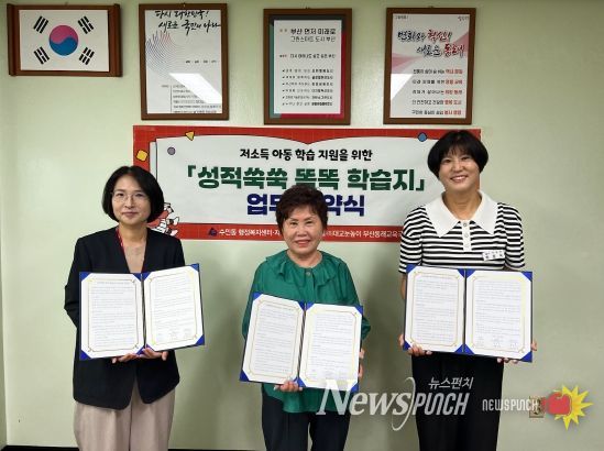 뉴스펀치 박상훈 기자 | 부산 동래구 수민동 지역사회보장협의체는 지난 19일 ㈜대교눈높이 부산동래교육국과 저소득 아동 학습지 지원사업 '성적쑥쑥 똑똑 학습지'협약을 체결했다고 밝혔다.