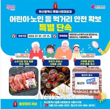 뉴스펀치 박상훈 기자 | 부산시 특별사법경찰과는 오는 7월 한 달간 어린이집·노인복지시설 집단급식소와 집단급식소 식품판매업소를 중심으로 식품 안전 관리 특별단속을 벌인다고 밝혔다.