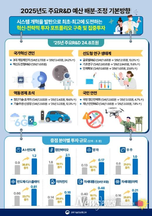 뉴스펀치 장은영 기자 | 과학기술정보통신부는 「2025년도 국가연구개발사업 예산 배분‧조정(안)」을 마련하고 6월 27일에 개최된 제9회 국가과학기술자문회의 심의회의에서 확정했다고 밝혔다.
