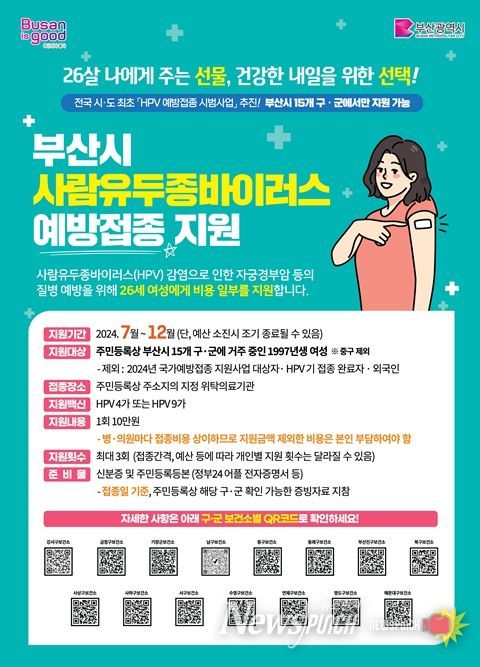 뉴스펀치 박상훈 기자 | 부산시는 전국 시·도 최초로 7월부터 26세 여성(1997년생) 대상 사람유두종바이러스 예방접종 비용 일부를 지원하는 시범사업을 시행한다고 밝혔다.