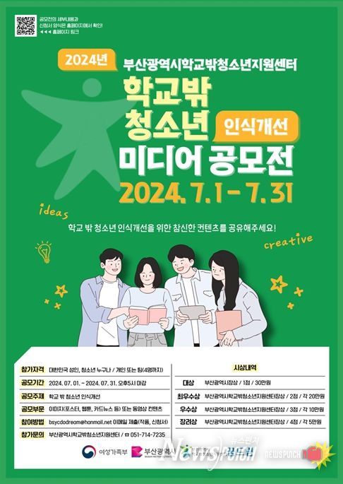 뉴스펀치 박상훈 기자 | 부산광역시학교밖청소년지원센터는 ‘2024년 부산광역시학교밖청소년지원센터 학교밖청소년 인식개선 미디어 공모전’을 개최한다.