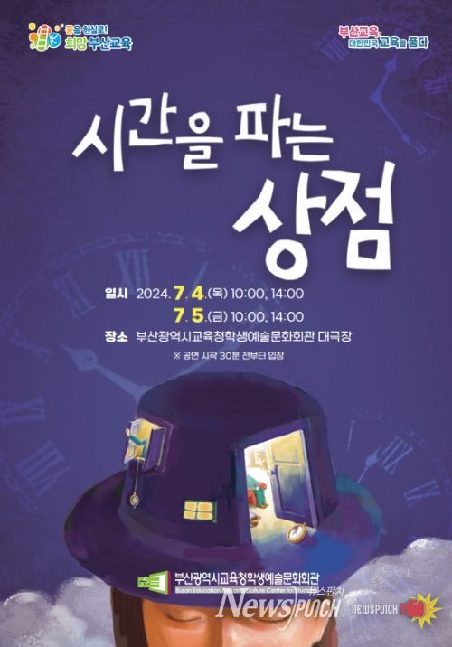 뉴스펀치 박상훈 기자 | 부산광역시교육청학생예술문화회관은 오는 7월 4일과 5일 양일간 오전 10시와 오후 2시에 학생예술문화회관 대극장에서 초등학생 5학년 이상 학생 3,000여 명을 대상으로 ‘시간을 파는 상점’ 공연을 개최한다.
