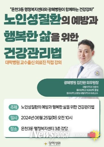 김진완 광혜병원 의무원장은 노인성 질환의 여러 특성에 관해 설명하고 노인성 질환을 크게 혈관성 질환, 근골격계 질환, 종양, 정신과적 문제로 분류하여 해당 질환에 대한 예방관리법에 대해 직접 시연도 하며 상세히 설명했다. 또한, 행복한 삶을 위한 노인의 건강관리법과 관련한 일상생활 체크리스트도 나눠 알려줬다.