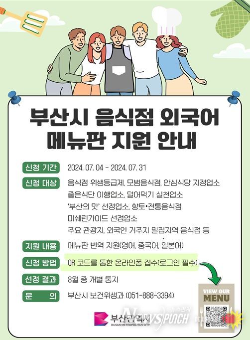 뉴스펀치 박상훈 기자 | 부산시는 오늘(4일)부터 7월 31일까지 '부산형 음식점 외국어메뉴판 지원사업' 참여 음식점을 모집한다고 밝혔다.