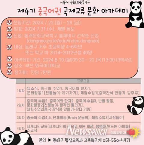 동래구에 거주하는 초등학생 4학년부터 6학년 또는 2012년부터 2014년생이면 신청 가능하며, 동래문화교육특구 홈페이지 에서 오는 7월 22일부터 26일까지 40명을 선착순 선발한다.