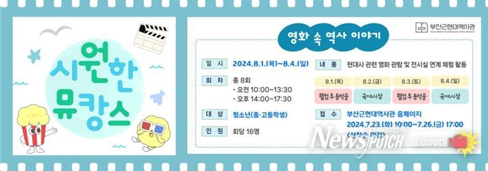 뉴스펀치 박상훈 기자 | 부산근현대역사관은 오는 8월 1일부터 4일까지 여름방학 청소년 역사문화 프로그램 '시원한 뮤캉스' '영화 속 역사 이야기'를 운영한다고 밝혔다.