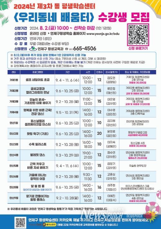 8월 2일 10시부터 연제구 평생학습 홈페이지에서 연제구민에 한해 1인 1강좌까지 신청할 수 있다.