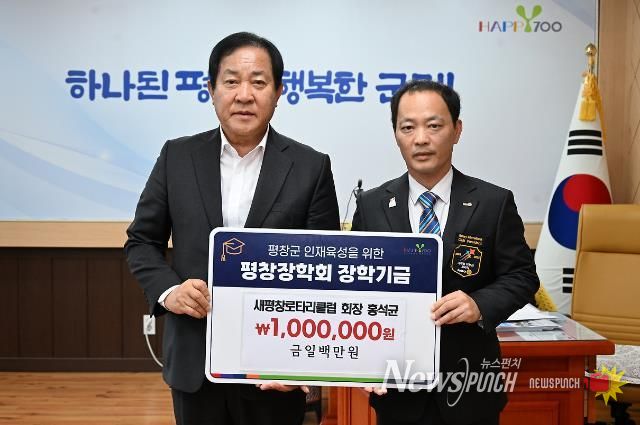 뉴스펀치 김호정 기자 | 홍석균 새평창로타리클럽 회장은 15일 평창군청을 방문하여 평창장학회에 장학금 1백만 원을 기탁했다.