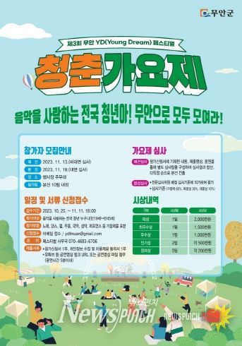 뉴스펀치 고서아 기자 | 청년도시 무안군은 오는 11월 17일부터 19일까지 남악중앙공원 일원에서 열리는 무안YD 페스티벌 경연행사인 ‘청춘가요제’ 참가자를 모집한다고 밝혔다.