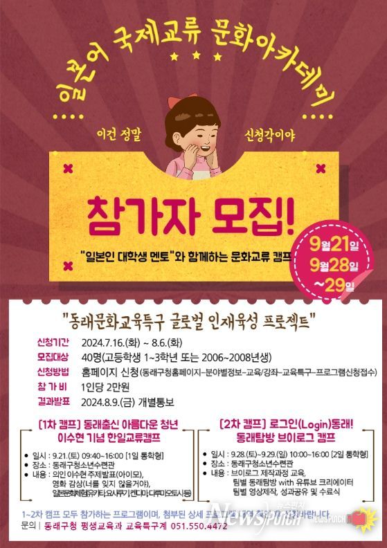 뉴스펀치 박상훈 기자 | 부산 동래구는 일본 문화 및 영상 제작에 관심 있는 고등학생을 대상으로 '일본어 국제교류 문화아카데미'를 운영한다고 밝혔다.