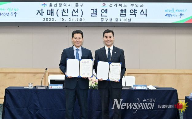 뉴스펀치 임정용 기자 | 울산 중구와 전북 부안군이 10월 31일 오후 2시 중구청 중회의실에서 상생 발전을 위한 자매결연 협약을 체결했다.