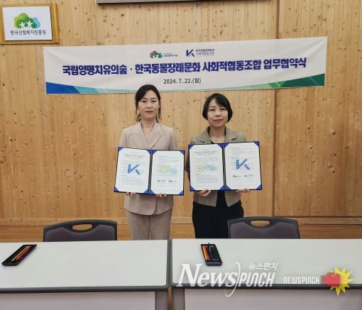 뉴스펀치 김호정 기자 | 산림청 한국산림복지진흥원 국립양평치유의숲은 22일 양평치유의숲에서 사람과 동물이 모두 함께 행복하고 건강한 반려 문화 조성을 위해 한국동물장례문화 사회적협동조합과 업무협약을 체결했다고 밝혔다.