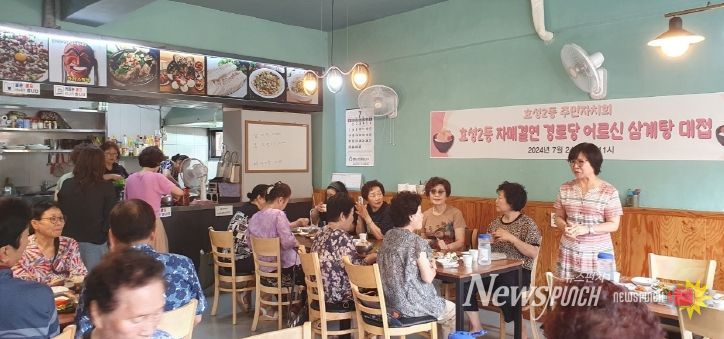 뉴스펀치 김성남 기자 | 인천광역시 계양구 효성2동 주민자치회는 지난 24일 중복을 맞아 효성2동 경로당 어르신 25명에게 삼계탕 대접 행사를 실시했다고 밝혔다.