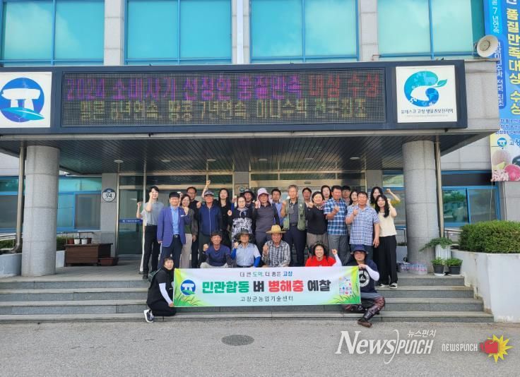 뉴스펀치 유동국 기자 | 고창군이 지난 26일 벼 병해충 피해를 최소화하기 위한 민관합동(농업기술센터-고창군수도연구회)으로 예찰을 실시했다.
