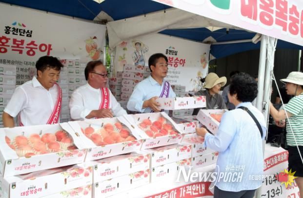 이번 판매행사는 화촌 농협과 홍천군농업기술센터에서 지원하며, 매년 이상기후의 피해로 어려움을 겪고 있는 농가들을 돕고, 소비자에겐 고품질 복숭아를 홍보하기 위해 마련되었다.