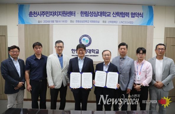 뉴스펀치 김호정 기자 | (재)춘천시주민자치지원센터와 한림성심대학교는 7일 14시 한림성심대학교 대학본부 국제회의실에서 양 기관의 지속적인 상호 교류와 저변 확대를 위한 업무협약을 체결했다.