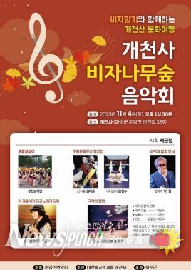뉴스펀치 고서아 기자 | 화순군은 깊어 가는 가을날 개천사 비자 향기와 함께하는 개천산 문화여행 행사를 11월 4일 토요일 오전 10시부터 오후 3시까지 춘양면번영회 주최로 국가 유산 천연기념물이 있는 개천사 비자림과 개천산 거북바위 등 개천사 일원에서 열릴 예정이라고 밝혔다.