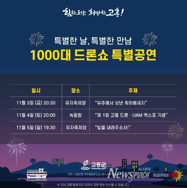 한편, 군 관계자는 드론쇼 공연은 우천 및 강풍 등 기상악화로 공연이 연기되거나 취소될 수 있으니, 사전에 고흥군 공식 홈페이지 등을 통해 수시로 확인해 줄 것 당부했다.