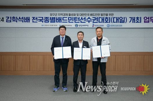 뉴스펀치 김호정 기자 | 양구군이 13일 오전 군청 중회의실에서 ‘2024 김학석배 전국종별배드민턴선수권대회’ 성공 개최를 위한 업무협약을 체결했다.
