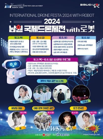 ‘2024 남원국제드론제전 with 로봇’은 2024년 10월 3일부터 6일까지 나흘간 남원종합스포츠타운에서 개최하며 ∆2024 국제드론·로봇 레저스포츠대회 ∆2024 남원 드론•로봇 전시 체험 & 컨퍼런스 ∆ 2024 남원 드론공연체험 페스티벌 ∆ 2024 남원 글로컬 푸드 페스티벌 등 네가지 테마로 꾸며진다.