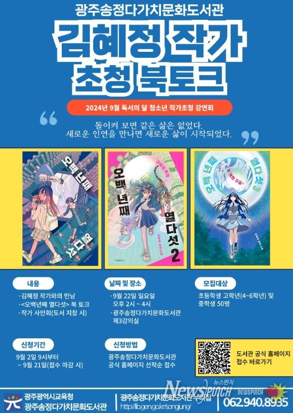 광주송정다가치문화도서관 박준수 관장은 “지역 학생들과 시민들이 함께 즐길 수 있는 도서관을 만들기 위해 다양한 강연을 준비했다”며 “이번 프로그램을 계기로 청소년들이 책은 물론 도서관과 가까워졌으면 한다”고 말했다.