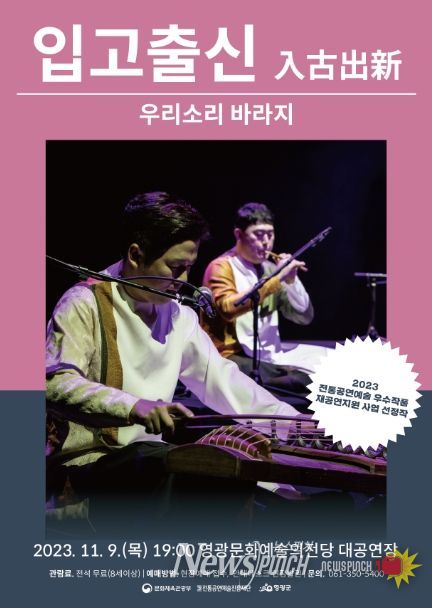 뉴스펀치 고서아 기자 | 영광군은 오는 11월 9일 오후 7시 영광문화예술의전당 대공연장에서‘우리소리 바라지’의 ‘입고출신’전통음악을 공연한다고 밝혔다.