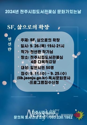 최현창 전주시 도서관본부장은 “선선함이 느껴지는 9월 독서의 달을 맞아 작가 강연과 함께 책을 더 깊이 있게 이해할 수 있는 계기가 되기를 바란다”고 말했다.