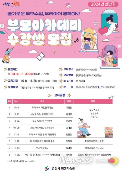 뉴스펀치 김종율 기자 | 영천시 평생학습관은 ‘2024년 하반기 부모아카데미’ 수강생을 오는 23일부터 30일까지 모집한다.
