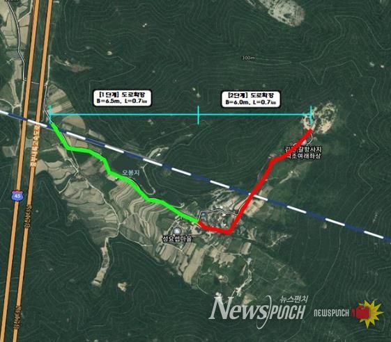 이에 김천시에서는 1단계 사업으로 오봉2리 갈항마을 진입로 확장에 올해 실시설계 및 보상을 시작으로 2026년까지 총사업비 16억 5천만 원을 투입해 도로 확장공사를(L=0.7㎞, B=6.5m) 완료할 계획이며,