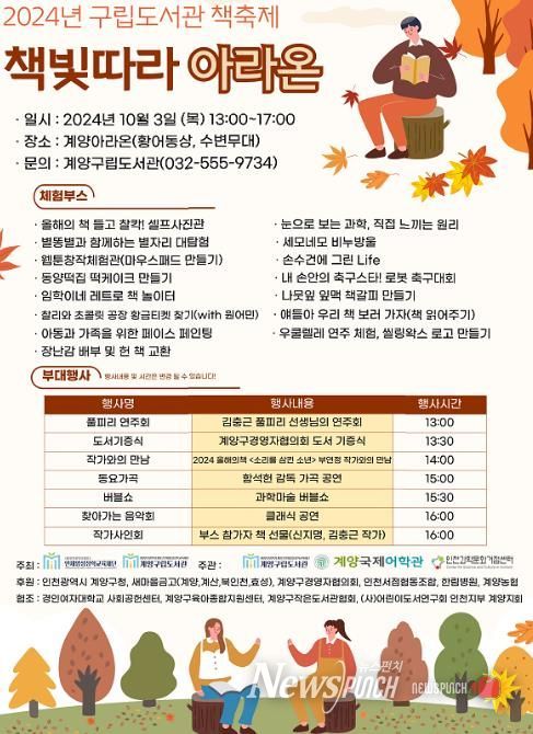 뉴스펀치 탁상훈 기자 | 재단법인인천광역시계양구인재양성장학교육재단 구립도서관이 오는 10월 3일 개천절에 2024 구립도서관 ‘책빛따라 아라온’을 개최해 다양한 체험부스와 공연행사를 개최한다.