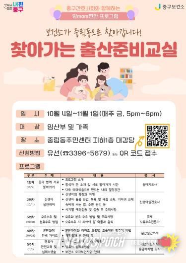 뉴스펀치 김완규 기자 | 서울 중구는 중구간호사회와 협력하여 10월 4일부터 11월 1일까지 매주 금요일마다 중림동에서 ‘찾아가는 출산준비교실’을 운영한다.
