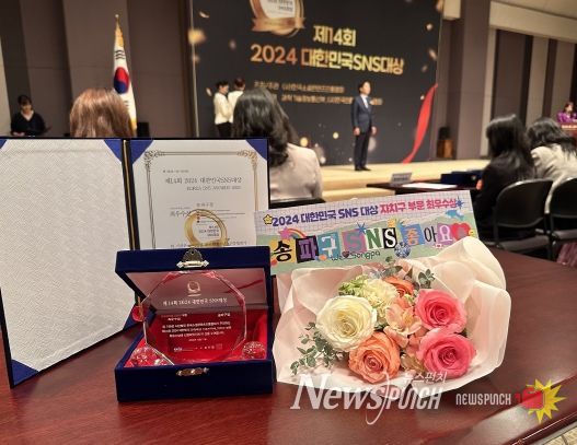 뉴스펀치 김완규 기자 | 송파구는 지난 10월 17일 한국프레스센터에서 열린 '2024 대한민국 SNS 대상'에서 기초지자체 부문 최우수상을 수상했다고 밝혔다.