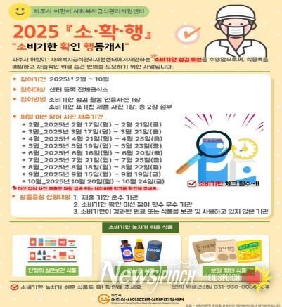 뉴스펀치 탁상훈 기자 | 파주시는 위탁기관인 파주시 어린이·사회복지급식관리지원센터에서 관내 소규모 급식소의 식재료 소비기한 관리를 강화하기 위해 ‘소·확·행(소비기한 확인 행동개시) 사업’을 실시한다고 밝혔다.