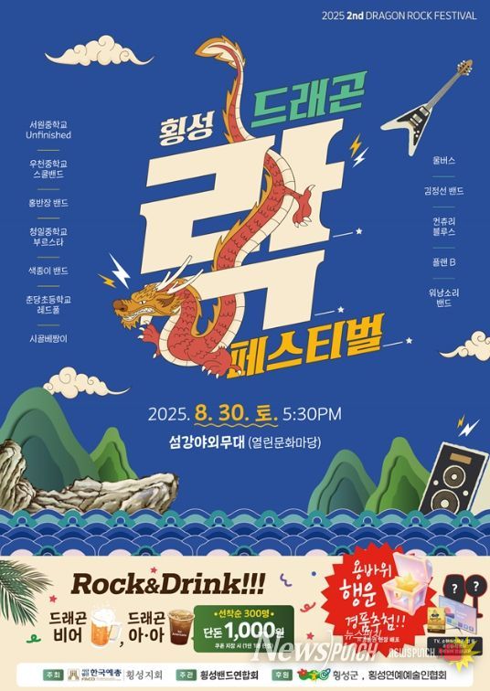 뉴스펀치 김보성 기자 | 횡성의 상징적 전설인 섬강 ‘용바위’가 음악으로 되살아난다. 한국예총 횡성지회(지회장 정재영)는 오는 30일 오후 5시 30분, 섬강 야외무대(열린문화마당)에서 '2025 횡성 드래곤 락 페스티벌'을 개최한다.