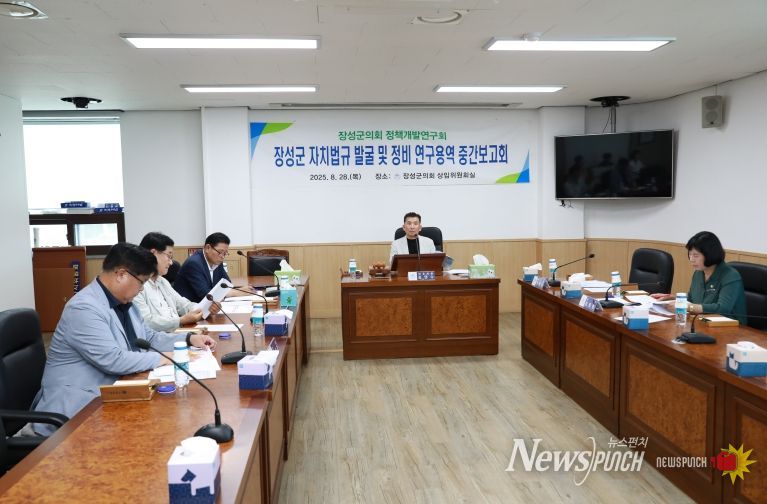 뉴스펀치 이현승 기자 | 장성군의회 의원연구단체 ‘정책개발연구회’(대표의원 김연수)는 지난 28일 군의회 상임위원회의실에서 ‘장성군의회 자치법규 발굴 및 정비 연구용역 중간보고회’를 개최했다.
