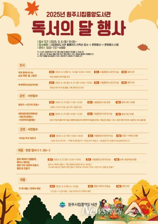 뉴스펀치 김보성 기자 | 원주시립중앙도서관은 9월 ‘독서의 달’을 기념해 다음 달 2일부터 27일까지 다양한 문화 행사를 운영한다.