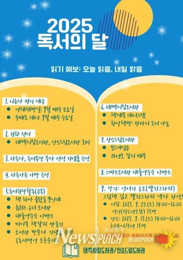 뉴스펀치 김보성 기자 | 태백시는 시민들의 독서 생활화와 도서관 이용 활성화를 위해 9월 한 달간 태백시립도서관과 산소드림도서관에서 ‘독서의 달’ 행사를 운영한다고 밝혔다.