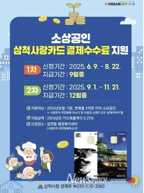 지원 대상은 삼척사랑카드 가맹점 가운데 연매출 5억 원 이하 소상공인으로, 전년도 삼척사랑카드 매출액의 0.25% 범위에서 카드결제수수료를 지원하며, 신청 기간은 9월 1일부터 11월 21일까지다.