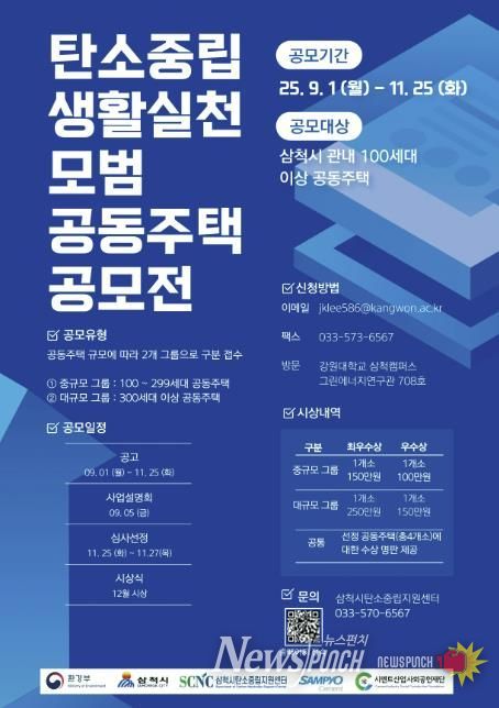 뉴스펀치 김보성 기자 | 삼척시 탄소중립센터는 기후변화에 대응하고 지속가능한 탄소중립 실천 문화를 확산하기 위해 '2025 삼척시 탄소중립 생활실천 모범 공동주택 공모사업'과 '2025 삼척시 탄소중립 시민참여 모범사례 공모사업'을 추진한다.