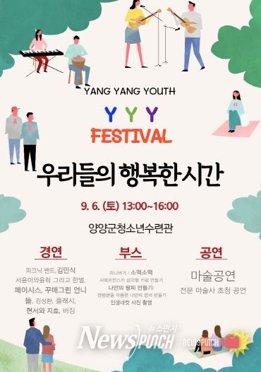 뉴스펀치 김보성 기자 | 양양군 청소년수련관은 오는 9월 6일 오후 1시부터 4시까지 ‘우리들의 행복한 시간’을 주제로 청소년 축제를 개최한다.