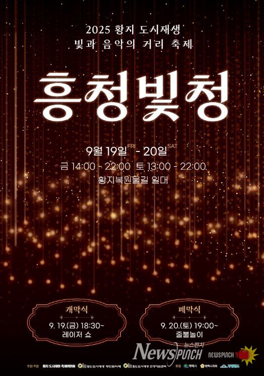 뉴스펀치 김보성 기자 | 태백시도시재생지원센터는 태백시 황지복원물길 일대에서 오는 9월 19일 14시부터 20일 22시까지 이틀간 '2025 황지 도시재생 빛과 음악의 거리 축제 ‘흥청빛청’'이 개최된다고 밝혔다.