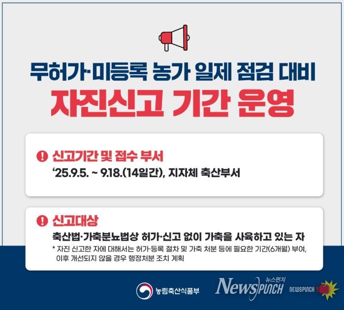 김종한 축산과장은 “방역의 사각지대에 있는 무허가·미등록 축사로 인해, 축산업 전체가 가축전염병과 재해의 위험에 노출될 수 있으므로, 지자체, 축산단체, 지역 축협 등 축산 관련 관계자와 축산농가 모두 축사 점검에 적극적으로 협조해달라”고 당부했다.