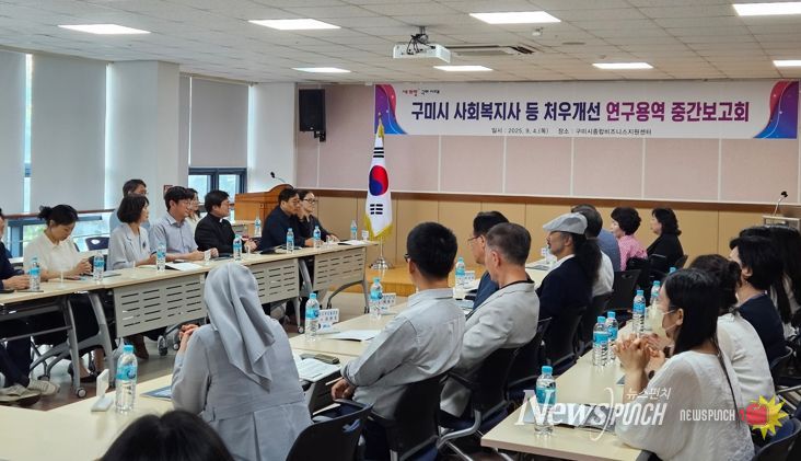 뉴스펀치 김종율 기자 | 구미시는 지난 4일 구미시종합비즈니스지원센터 대회의실에서 사회복지시설과 단체 종사자 50여 명이 참석한 가운데 '사회복지사 등 처우개선 실태조사를 통한 3개년 종합계획 수립 연구용역' 중간보고회를 열었다.