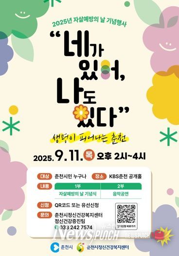 춘천시(시장 육동한)와 춘천시정신건강복지센터가 오는 11일 오후 2시 KBS춘천 공개홀에서 2025년 자살예방의 날 기념행사를 개최한다.