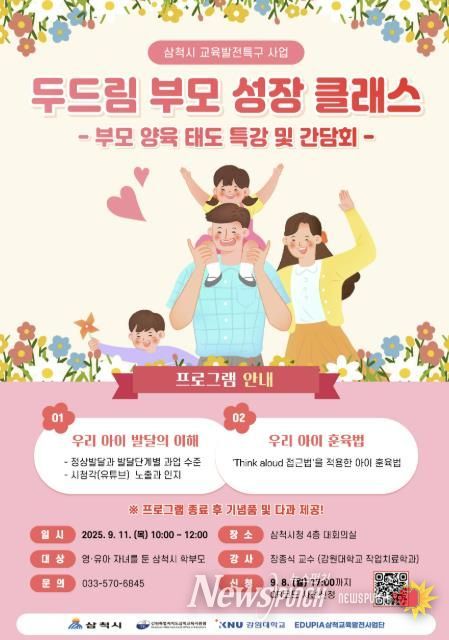 뉴스펀치 김보성 기자 | 삼척시가 EDUPIA삼척교육발전사업단과 함께 교육발전특구 시범지역 사업의 일환으로 오는 9월 11일 오전 10시 삼척시청 대회의실에서 '두드림 부모 성장 클래스'를 개최한다.