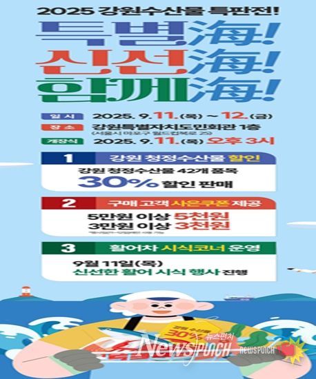 뉴스펀치 김호정 기자 | 강원특별자치도는 오는 9월 11일부터 12일까지 서울 마포구 강원특별자치도민회관에서 『대도시 수산물 특판전』을 개최한다고 밝혔다.
